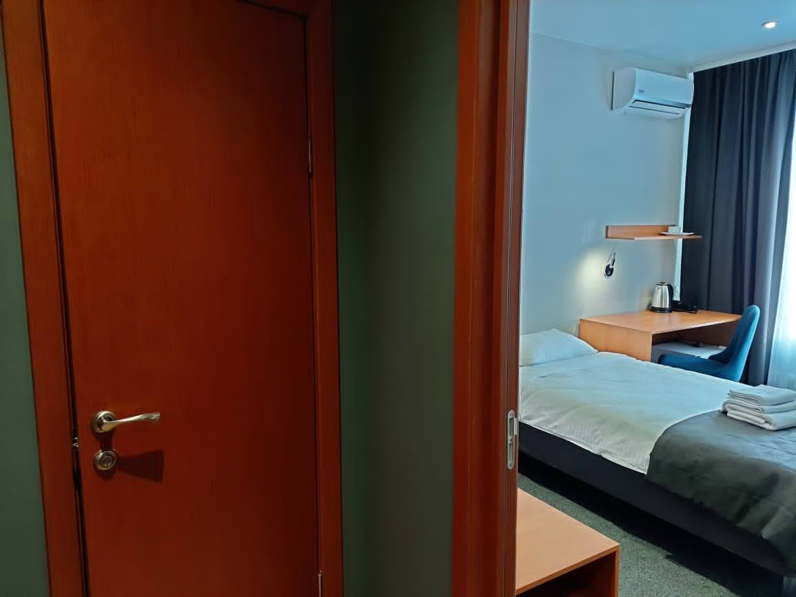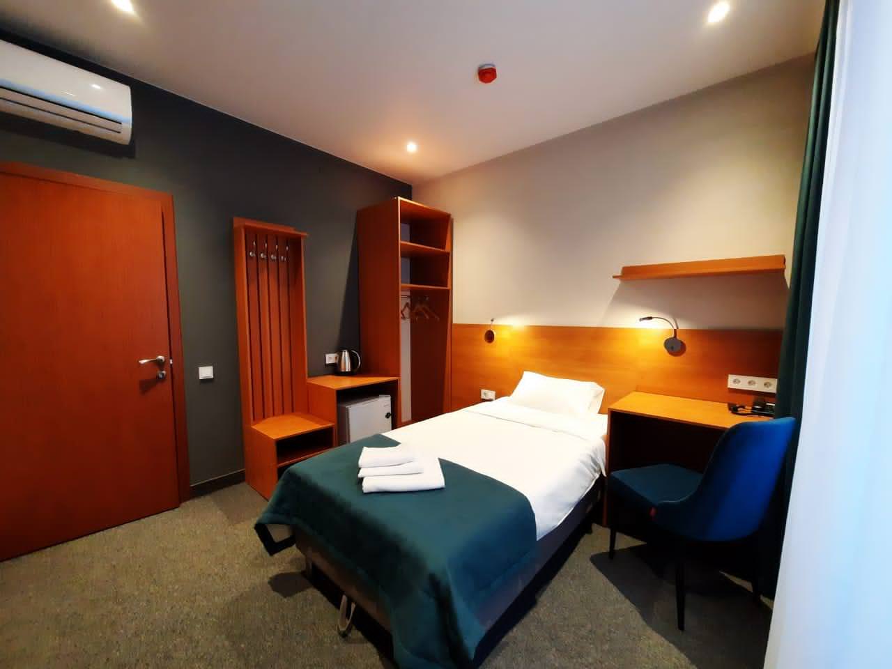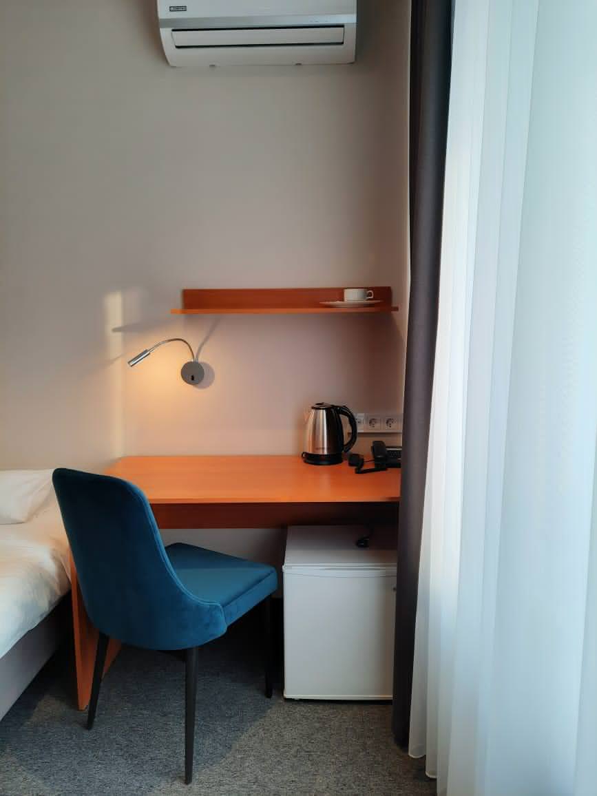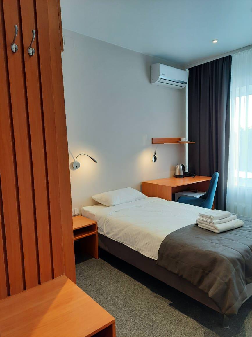 В номере 1 одноместная кровать, шкаф для одежды, кресло, рабочий стол, кондиционер, плазменный ТВ, холодильник, чайник, чайная пара. Ванная комната общая на 2 номера.
