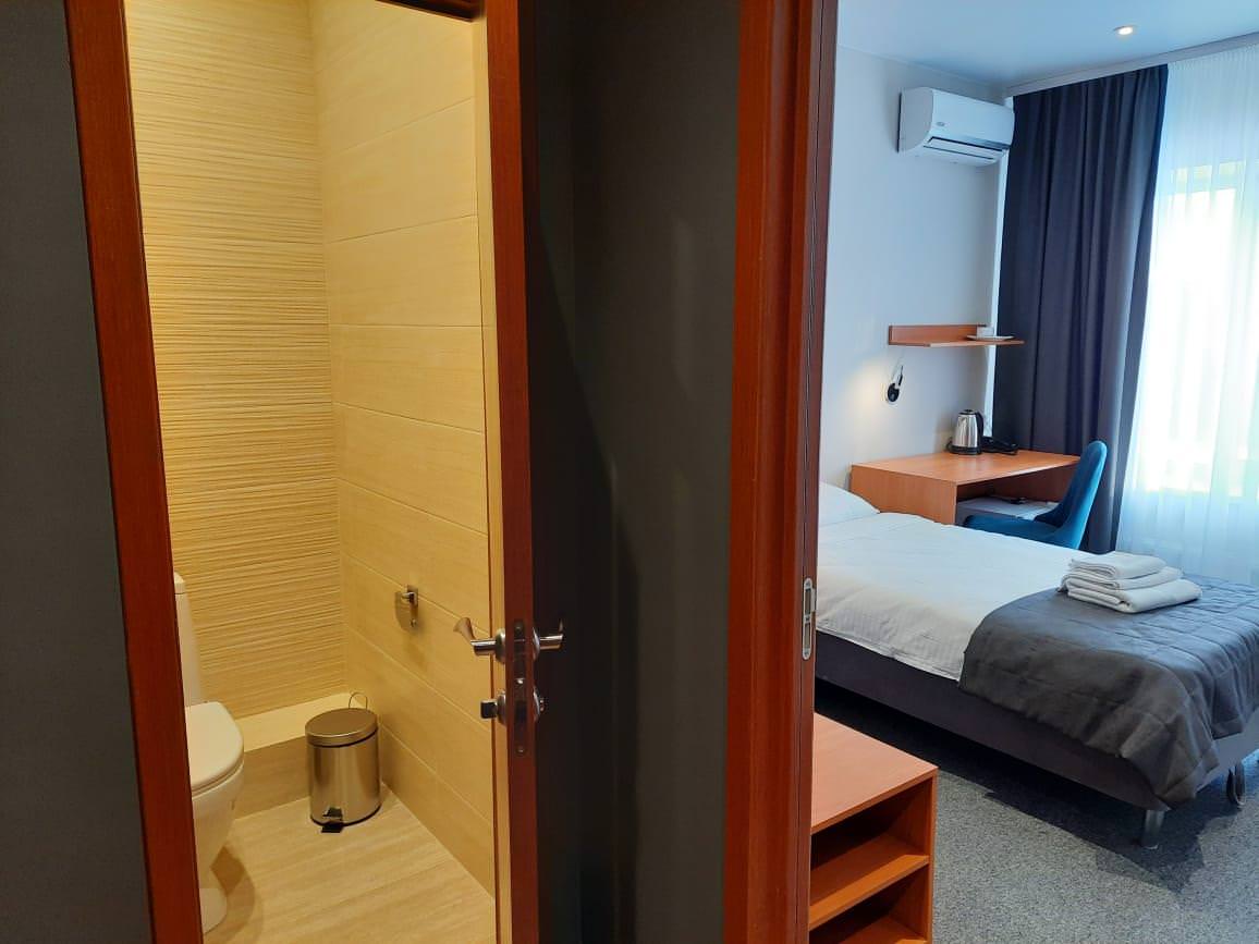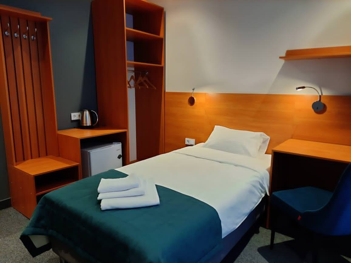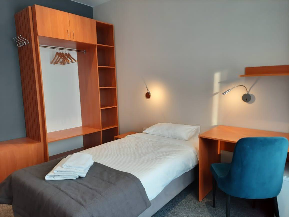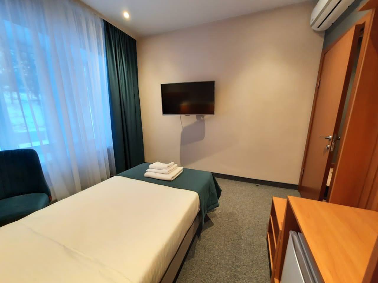 В номере 1 одноместная кровать, шкаф для одежды, кресло, рабочий стол, кондиционер, плазменный ТВ, холодильник, чайник, чайная пара. Ванная комната общая на 2 номера.
